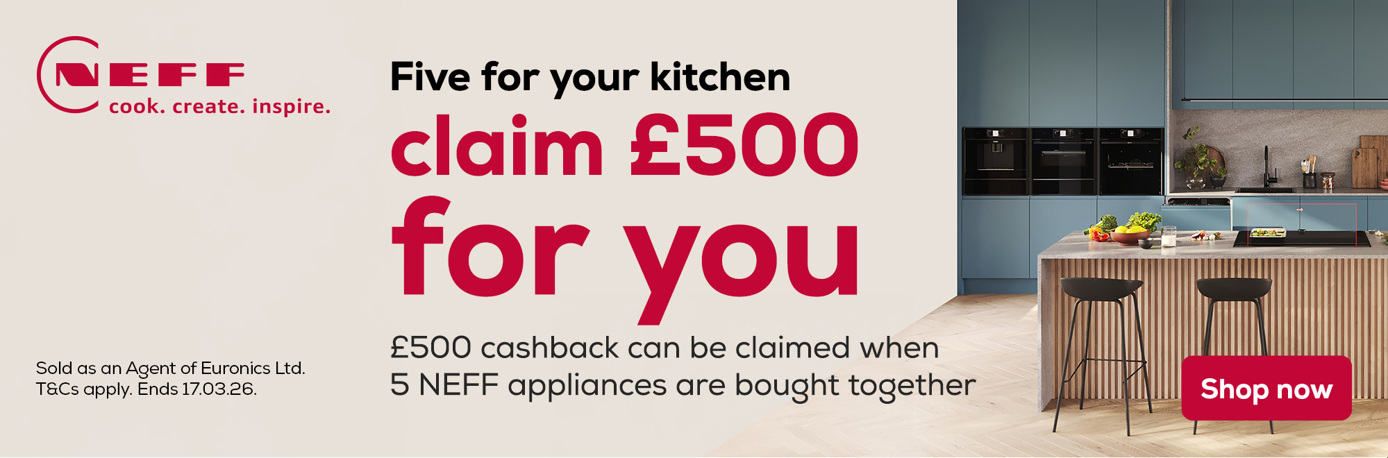 Simply buy 5 NEFF appliances to claim £500 cashback. All NEFF Appliances are included on this offer.