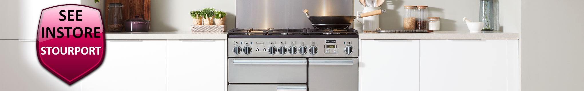Choose from 110cm, 100cm or 90cm widths in traditional colours of Stainless Steel, Black, Cranberry or Cream, all with chrome trim and dual fuel, induction, ceramic or gas hotplates.